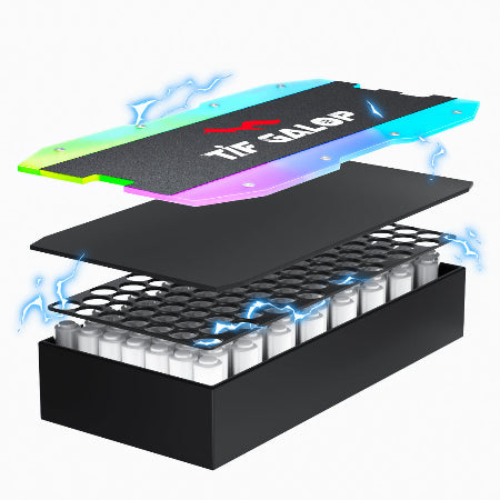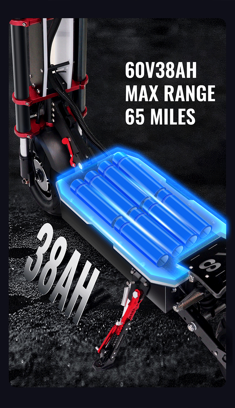 Utilizing the newly developed 18650 battery cells from Samsung SDI, each lithium-ion single cell measures 18mm in diameter and 65mm in length, combining to form a 60V38Ah configuration. Tifgalop scooter incorporates a quick-detachable sealed design achieving an IPX-6 waterproof rating. The battery is removable for charging and holds UL 2271 international certification.